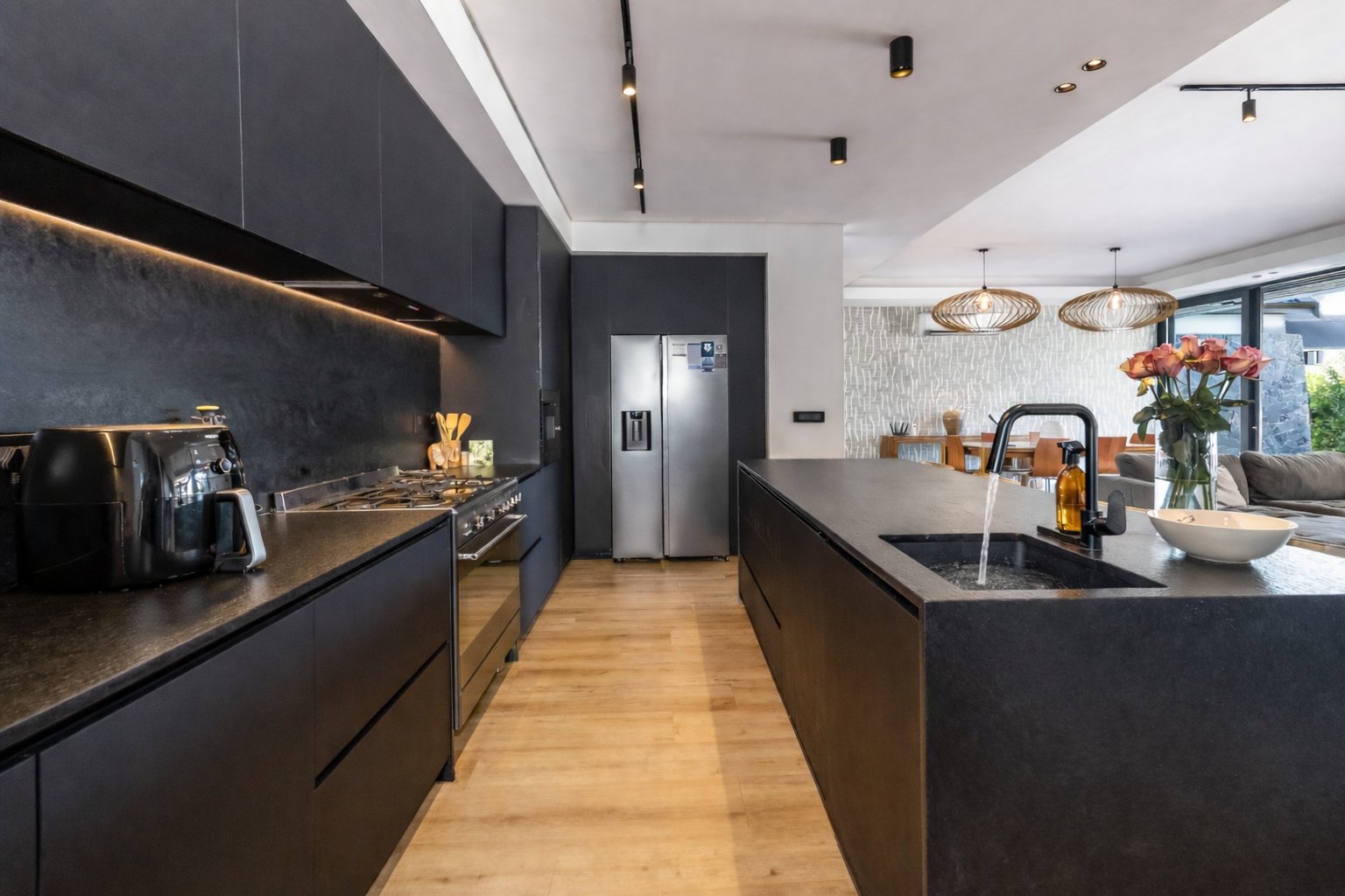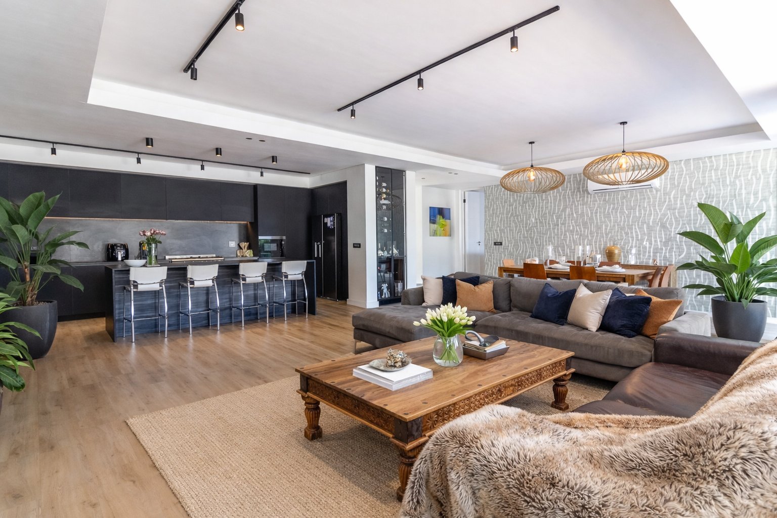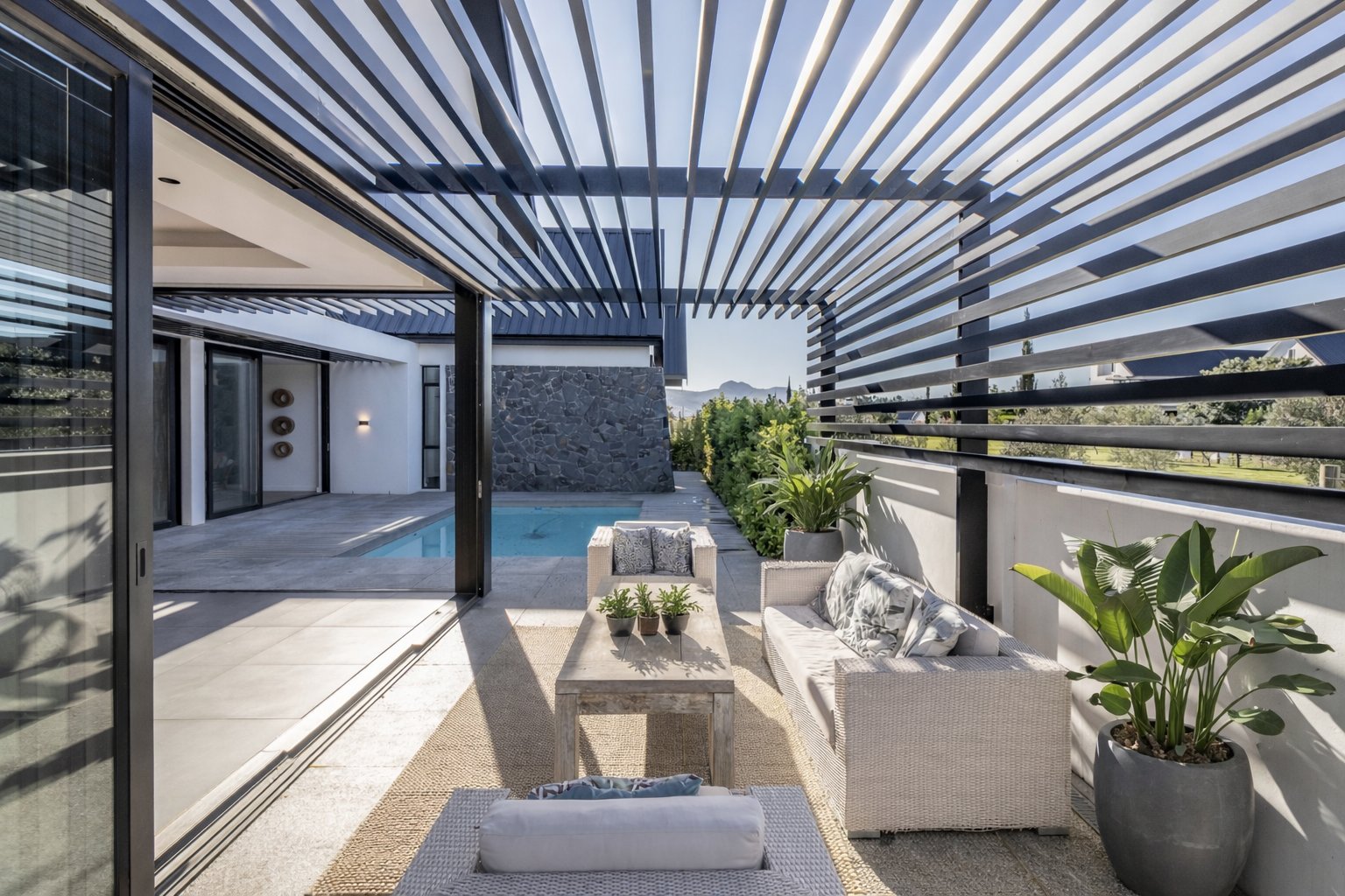 At its centre, expansive open-plan living and dining spaces transition effortlessly to a covered entertainer’s patio and sun-drenched pool deck, where uninterrupted mountain vistas create a sense of calm and grandeur. The statement designer black kitchen, both sculptural and functional, anchors the home — a sophisticated hub for daily living and elevated entertaining alike.