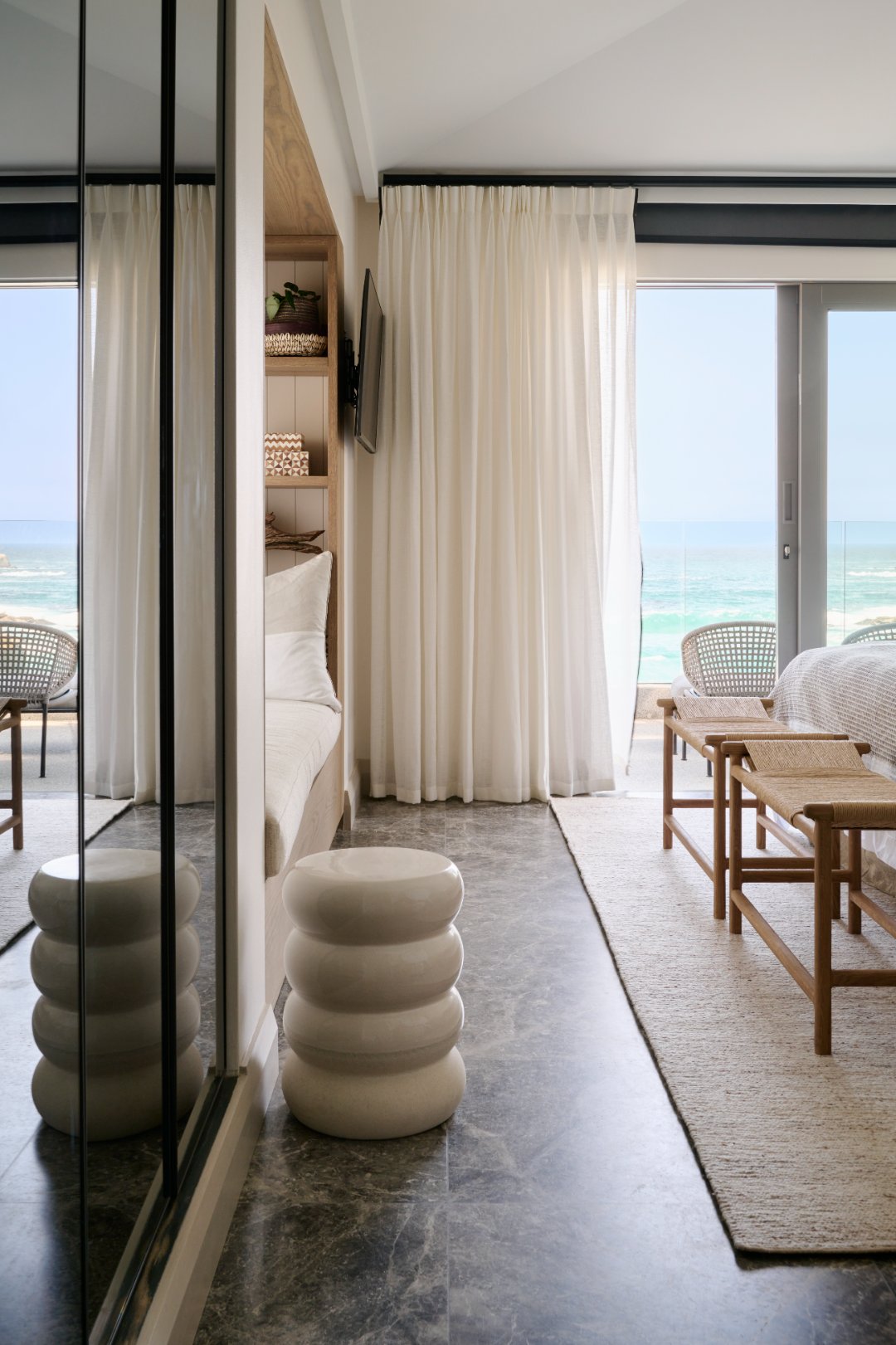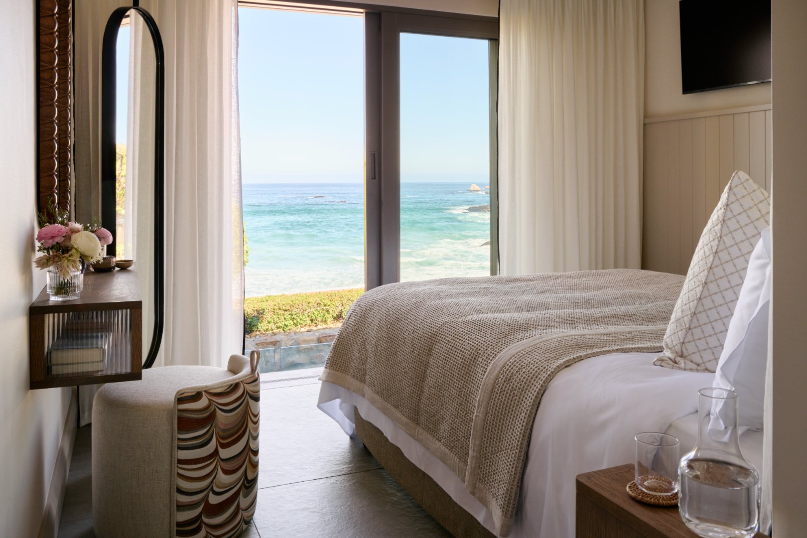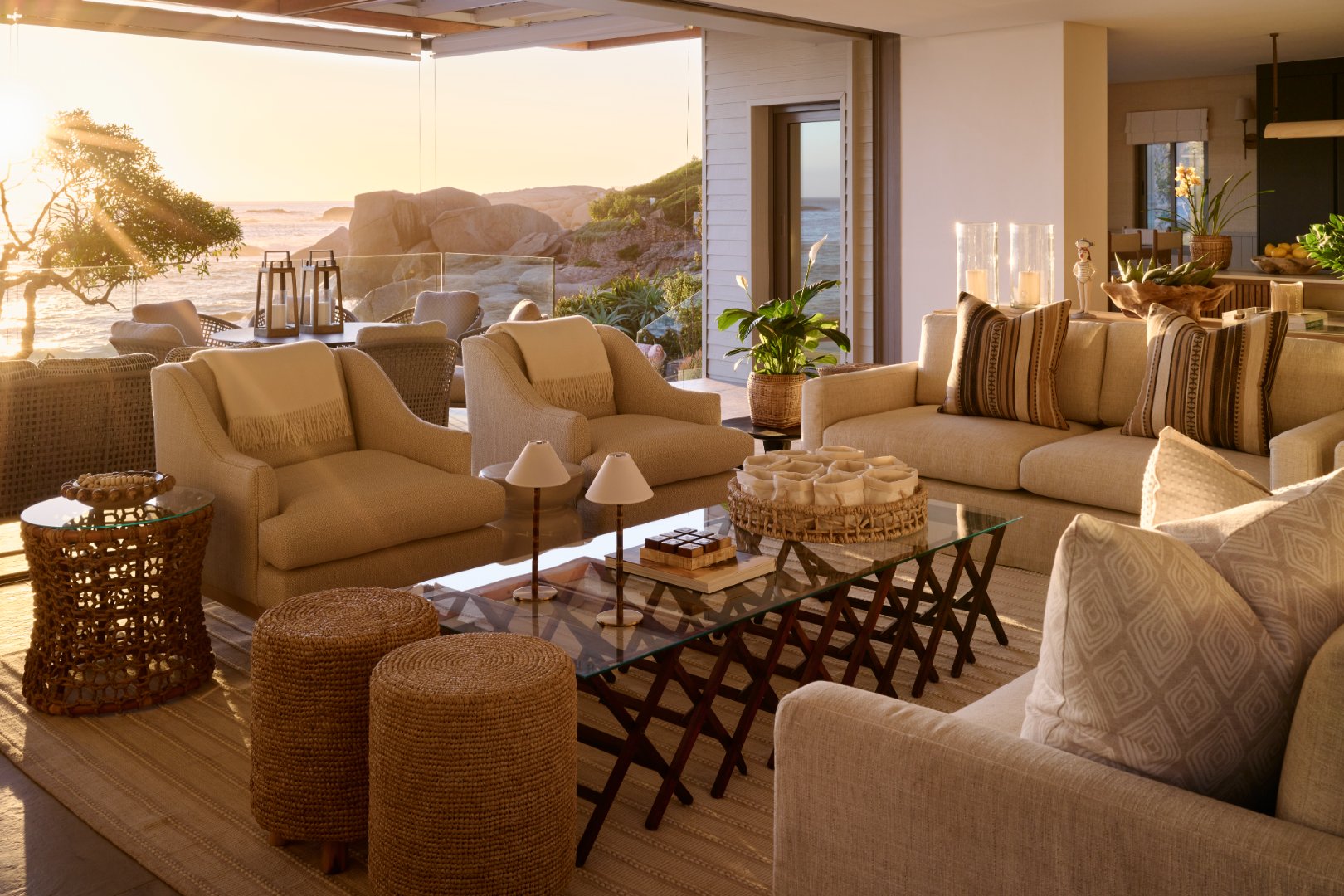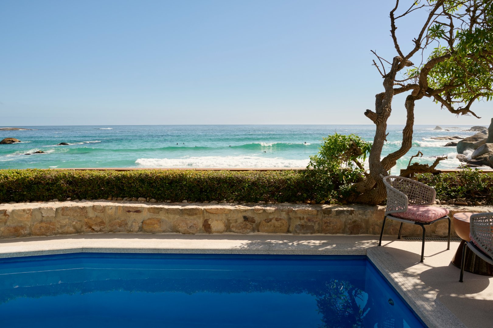 The villa accommodates 10 guests across 5 beautifully appointed en-suite bedrooms, offering uninterrupted views of both the Atlantic Ocean and the Twelve Apostles mountain range. Expansive open-plan living spaces flow seamlessly outdoors, where the private pool, sun loungers, and direct beach access invite slow mornings and golden afternoons.